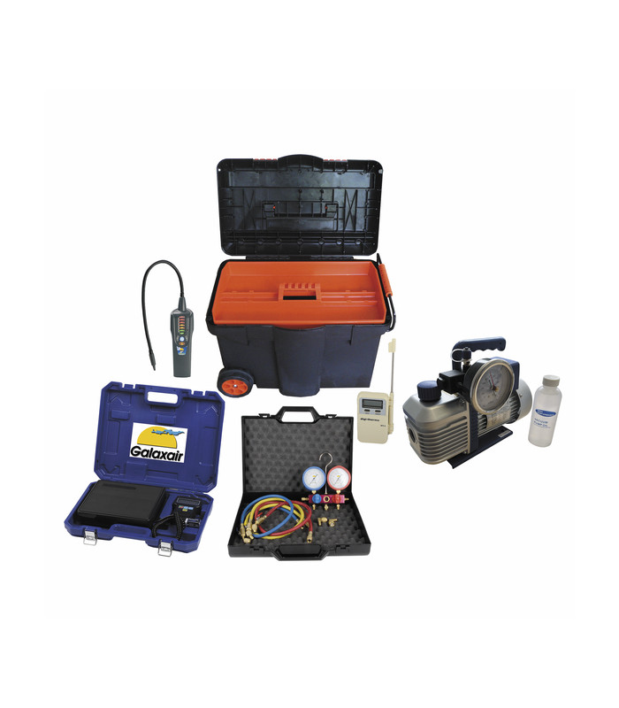 Kit complet pour techniciens frigoristes, le pack "Les Essentiels" Galaxair R32 regroupe tous les outils indispensables pour le diagnostic, la charge et l'entretien des installations au R32, avec malle de transport à roulettes.