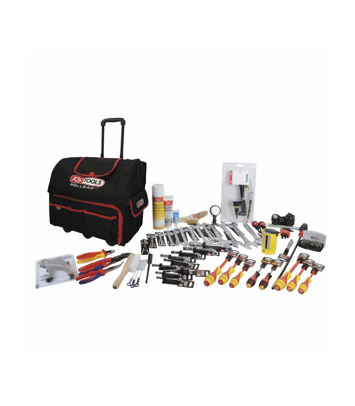 Sac de transport ultra-résistant avec bras télescopique, roulettes, et porte-outils amovible. Il contient un kit complet de plus de 50 outils professionnels, dont tournevis, pinces KNIPEX, clés plates, clés à pipe, accessoires de nettoyage, instruments de mesure (manomètre, thermomètre, pompe, débitlitre), ainsi que des produits d'entretien. Capacité 40 L, charge max 35 kg. Idéal pour les techniciens itinérants.