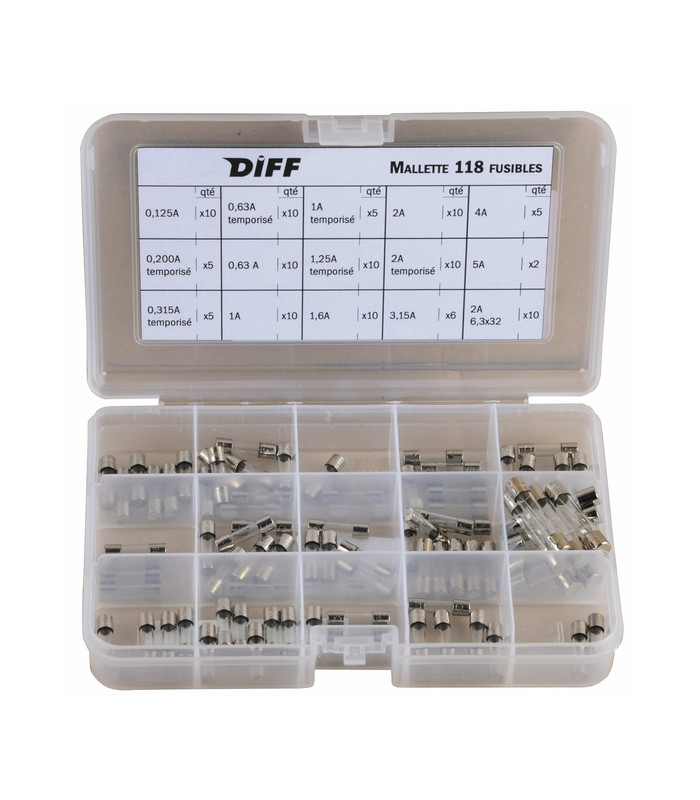 Mallette composée de : Fusible 0,125A (5mm x 20mm) x 10 pièces Fusible 1,6A (5mm x 20mm) x 10 pièces Fusible 0,200A Temporisé(5mm x 20mm) x 5 pièces Fusible 2A (5mm x 20mm) x 10 pièces Fusible 0,315A Temporisé (5mm x 20mm) x 5 pièces Fusible 2A Temporisé (5mm x 20mm) x 10 pièces Fusible 0,63A Temporisé (5mm x 20mm) x 10 pièces Fusible 3,15A (5mm x 20mm) x 6 pièces Fusible 0,63A (5mm x 20mm) x 10 pièces Fusible 4A (5mm x 20mm) x 5 pièces Fusible 1A (5mm x 20mm) x 10 pièces Fusible 5A (5mm x 20mm) x 2 pièces Fusible 1A Temporisé (5mm x20mm) x 5 pièces Fusible 2A (6,3mm x 32mm) x 10 pièces Fusible 1,25A Temporisé (5mm x 20mm) x 10 pièces