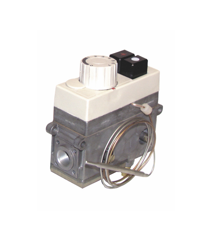 0.710 MINISIT Bloc gaz avec 2 boutons de commande et arrêt, 1 bouton thermostatique à bulbe sans régulateur, sans piezo, avec capot Droit F1/2 x droit F3/8 Pression entrée 50 mbars Particularité : pour friteuse