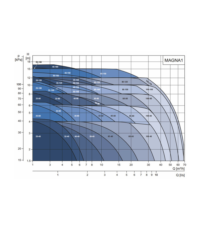 The new MAGNA1 is the simple option for a job well done. It is the ideal choice to replace older circulator pumps and, due to its compliance with standard EuP 2015 and its Energy Efficiency Index (EEI) well below 0.23, it offers substantial savings in electrical energy. MAGNA1 is the ideal choice for the basic needs of installations requiring simple control and monitoring.. Monitoring via the fault relay, providing peace of mind Start/stop digital input available for pump remote control Continuous operation and reduced downtime with the wireless dual pump function (available on dual pumps) High energy efficiency resulting in substantial savings on electricity Easy installation and one-touch start-up No maintenance due to the design of the wet rotor motor. The MAGNA1 is the ideal and efficient choice for most applications (9 operating curves), including: Heating Main Pump Mixing loop Heating floor Cooling Cooling floor Geothermal pump systems Small cooling applications Liquid temperature range: -10?110°C Ambient temperature range: 0?40°C Insulating shell provided for heating, optional for air conditioning Gaskets provided