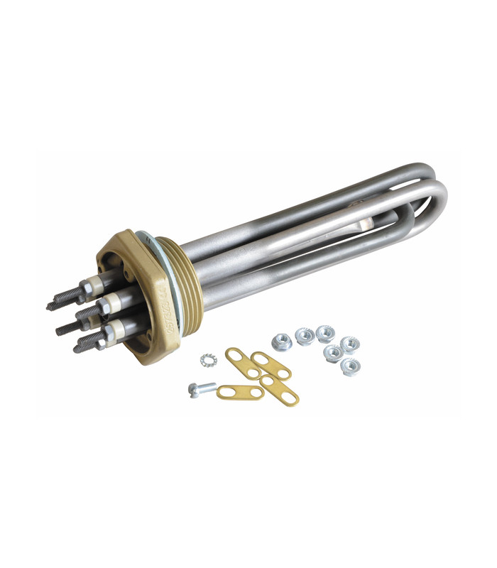 Screw-on immersion heater with immersion sleeve . Delivered with fiber gasket and plug-in case Features: - Power: 3 kW - Voltage: 230/400V mono or triphase - Length : 290 mm - Brass-plated plug Ø : M77 - Number of elemens: 3