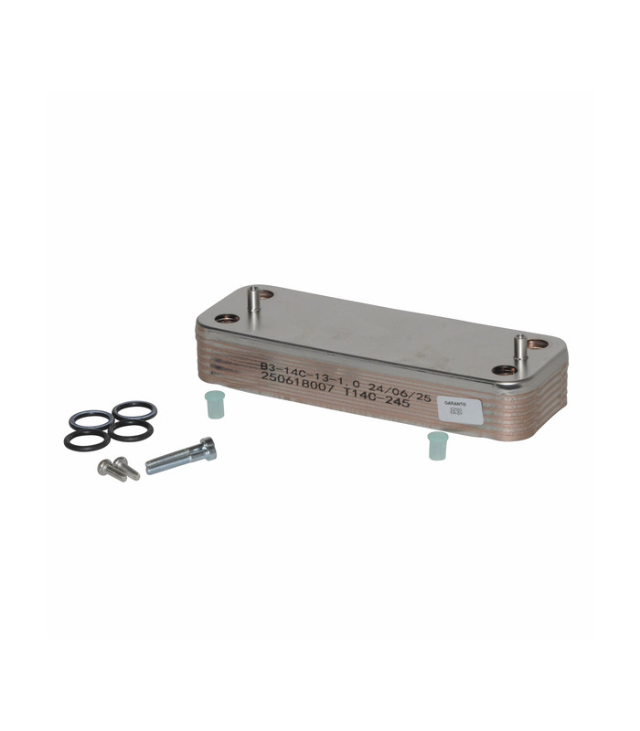 This sanitary heat exchanger is designed to ensure efficient heat transfer between the heating circuit and the domestic hot water circuit of De Dietrich Chappée boilers. Composed of 12 stainless steel plates, it guarantees excellent thermal conductivity and long-lasting corrosion resistance.
