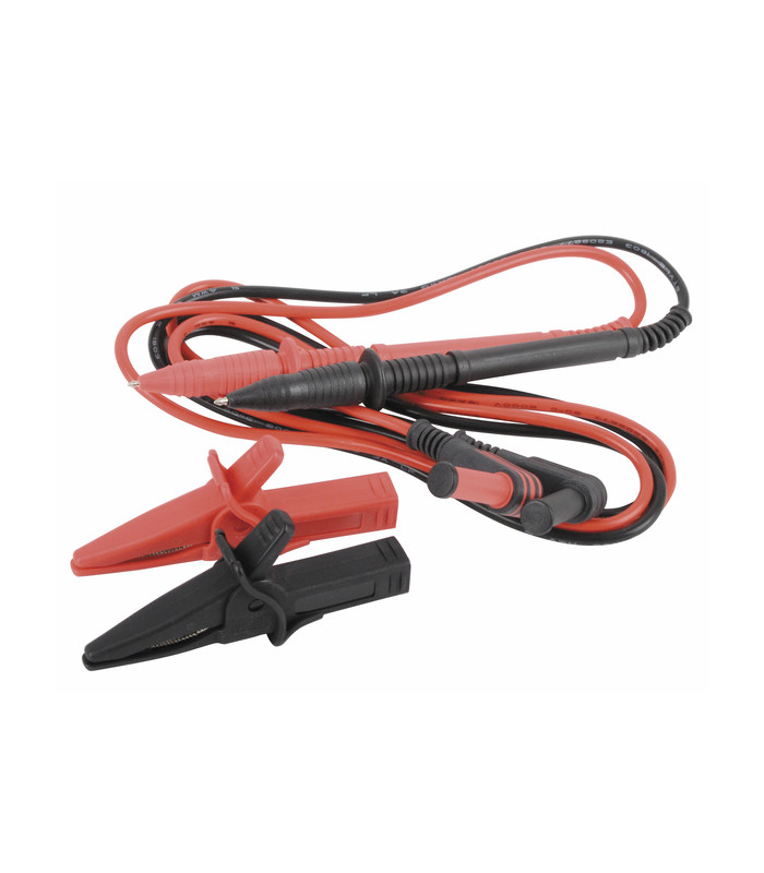 Juego de 2 cordones rojo y negro incluyendo: en un extremo una ficha escuadra para un montaje sobre multimetro En el otro, una punta fileteada que Permite el montaje de la pinza cocodrillo aislada.