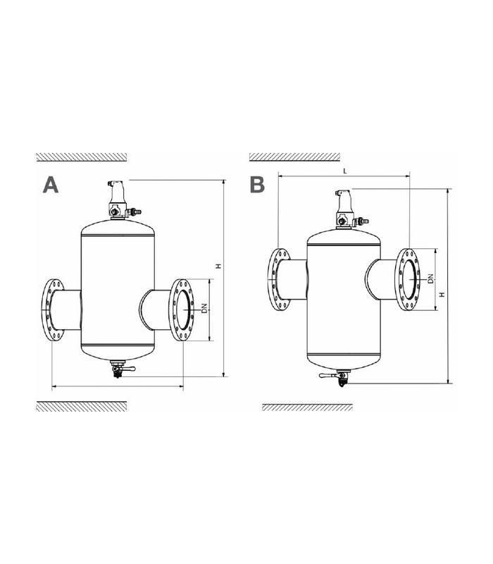 Separador ZIO para microburbujas o partículas de lodo Para su uso en sistemas de calefacción, solar y refrigeración Eficiencia excepcional gracias al separador helicoidal HELISTILL Sistemas libres de aire y lodo sin filtros que se obstruyan y que necesiten un mantenimiento regular Tipo industrial, conexión de bridas PN16 Conexión a tubería horizontal 2 tipos de instalación posibles (ver esquema) A: Separador de microburbujas (en la salida) B: Separador de partículas de lodo (en la línea de retorno) Anticongelante permitido hasta el 50 % Temperatura máx.