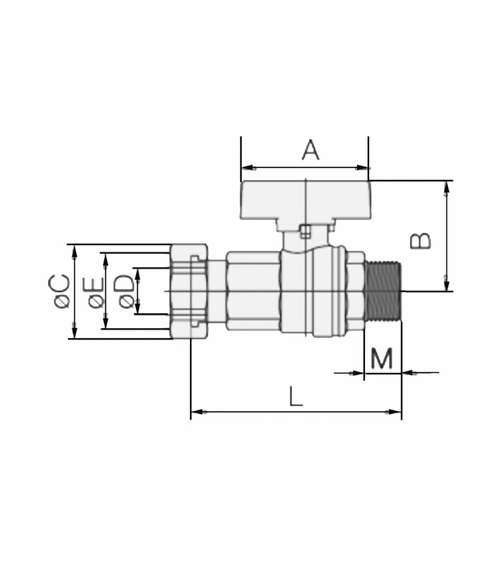 Límites de temperatura: para fluidos de -15 °C a +110 °C Límites de presión: para fluidos de 40b Varilla: antiexplosión Junta lateral: PTFE virgen de alta resistencia Estanqueidad superior: 4 juntas (1 junta de PTFE de alta presión, 2 juntas cónicas antifricción de PTFE de media y baja presión y 1 junta tórica - baja presión) Válvula (ON-OFF) para contador de agua con orificio de sellado en la tuerca Rosca estándar según las normas UNI ISO 228/1