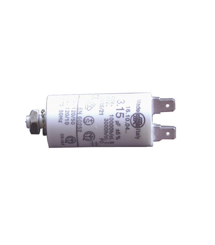 Bajo TENSION en permanencia, aseguran al motor un suministro de una fase auxiliar. El voltaje mencionado sobre el cuerpo de los condensadores no tiene nada que ver con la TENSION sector. La sustitución por un condensador de voltaje superior es posible, pero no el contrario. Si el condensador de sustitución tiene una capacidad en micro farad (µF) mayor o menor de 20%, el motor puede arrancar pero proporciona una velocidad y un par insuficiente, perjudicial para su longevidad. Entregado con kit conteniendo:- Tubo PVC - TENSION de servicio 400/500 volts alternativos - 2 bornes llanas a engastar 6.5 - 1 tuerca para fijación