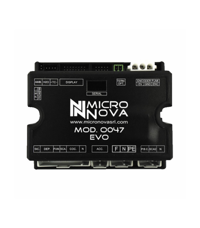 Referencia PO047-C02/O047 EVO Fijación de la tarjeta mediante 2 orificios Conectable sensor de humos hasta 600°C Conectable sensor de temperatura ambiente Preparada para codificador Conector RS232 para conexión a PC Programable por pantalla o por PC (con conexión a la interfaz RS232 de SERAMI o por el software SERAMINET) en menú de usuario o instalador