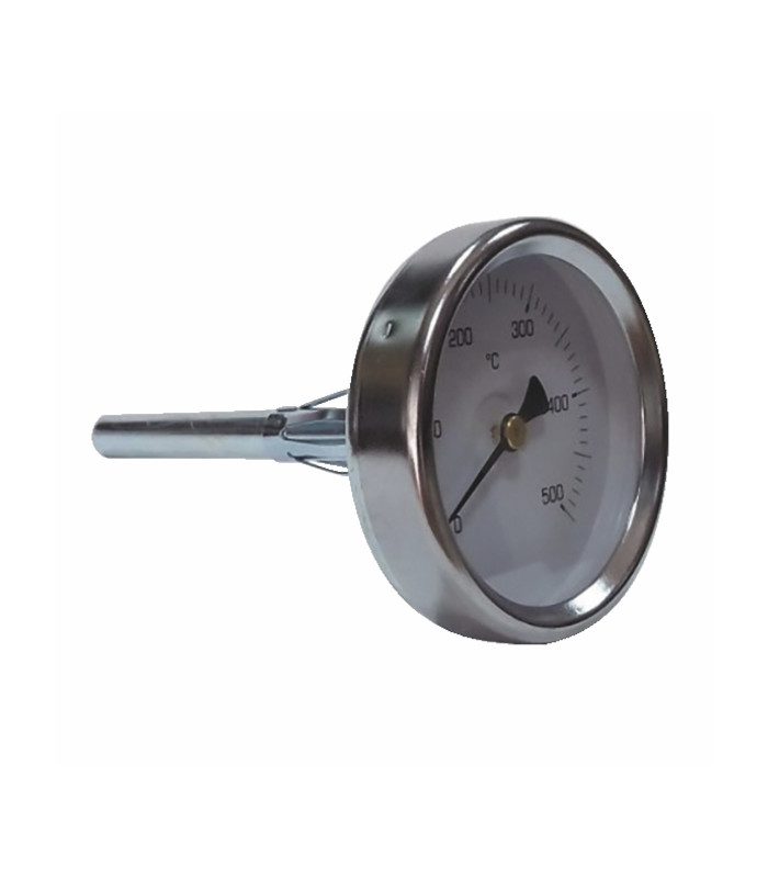 Temperatura: 0-500°C Caja: acero galvanizado Ø de la esfera: 63 mm Longitud de inmersión: 150 mm Ø de inmersión: 9 mm Precisión: >= 2 % Protección: IP31 Termómetro de alta temperatura para hornos de leña y barbacoas Indicador de fácil lectura con barras graduadas cada 10°C