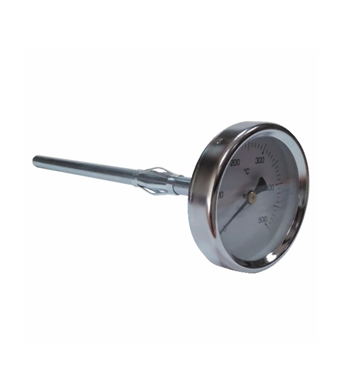 Temperatura: 0-500°C Caja: acero galvanizado Ø de la esfera: 63 mm Longitud de inmersión: 200 mm Ø de inmersión: 9 mm Precisión: >= 2 % Protección: IP31 Termómetro de alta temperatura para hornos de leña y barbacoas Indicador de fácil lectura con barras graduadas cada 10°C